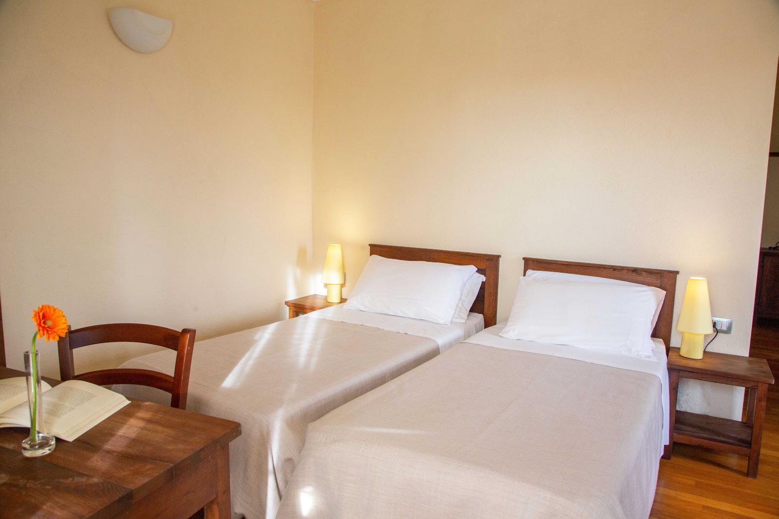 STANDARD room with 2 beds 90 x190 with a window overlooking the Certosa1515 park, equipped with two single beds. Arte povera style furnishings with wooden furniture and parquet. En-suite bathroom with shower and hairdryer.