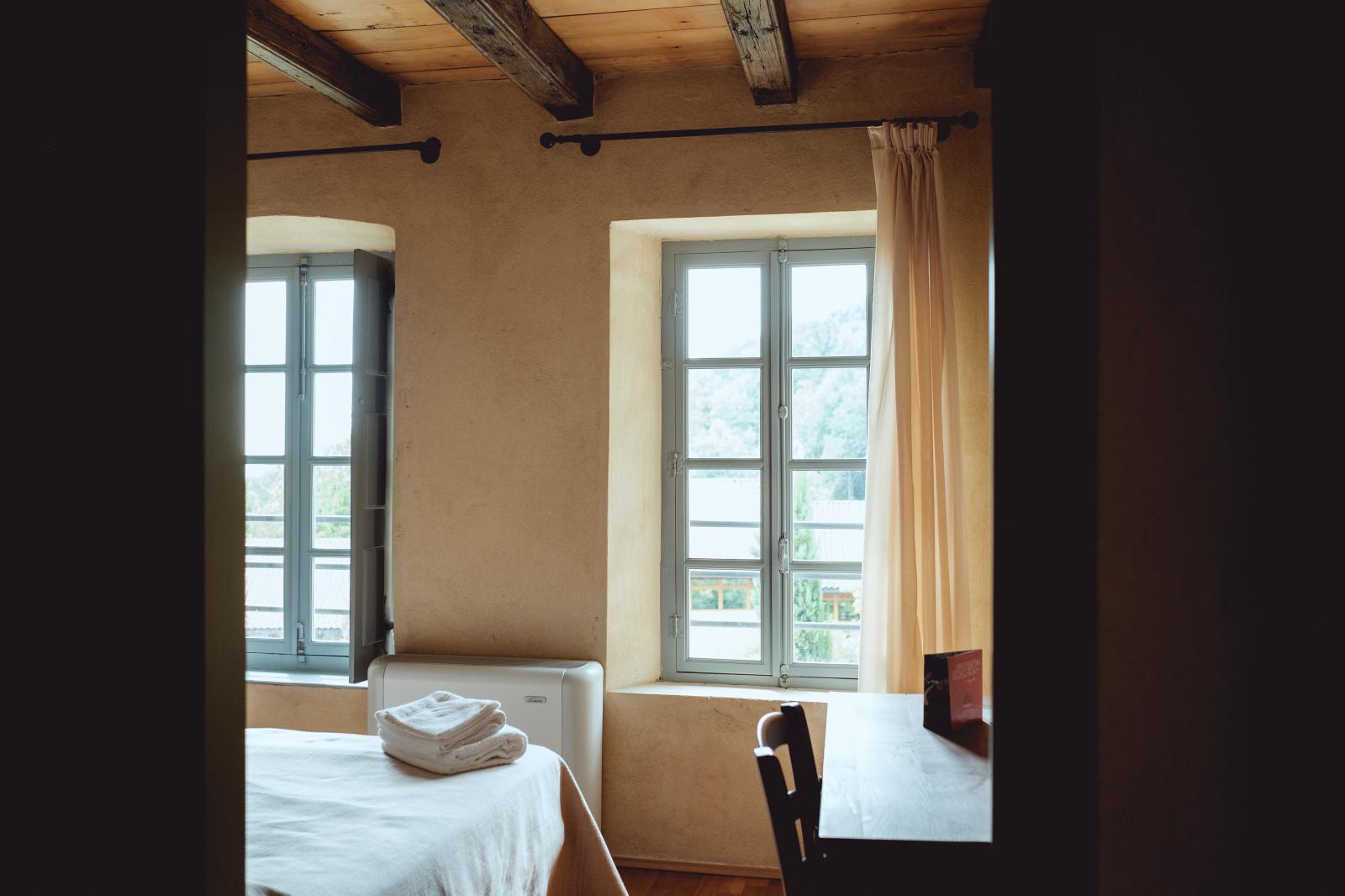 STANDARD room with double bed (180 x 195 cm), with windows overlooking the Certosa1515 park. Simple furnishings in poor art style with wooden furniture and parquet. En-suite bathroom with shower and hairdryer.